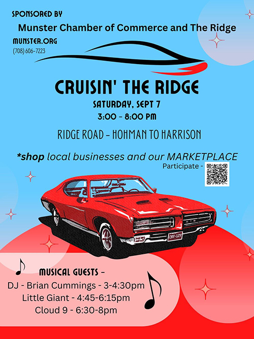 Munsterites will have the opportunity to hang out, see some cool rides, visit many businesses and talk with local organizations on the Northwest side of town this weekend at the first Cruisin’ The Ridge Event on Saturday from 3-8pm.